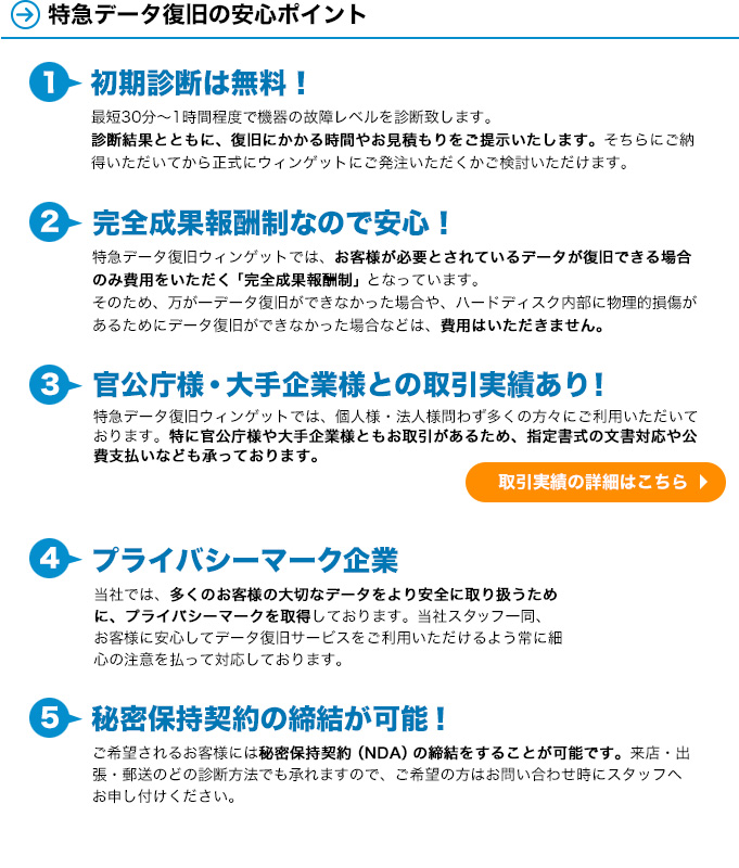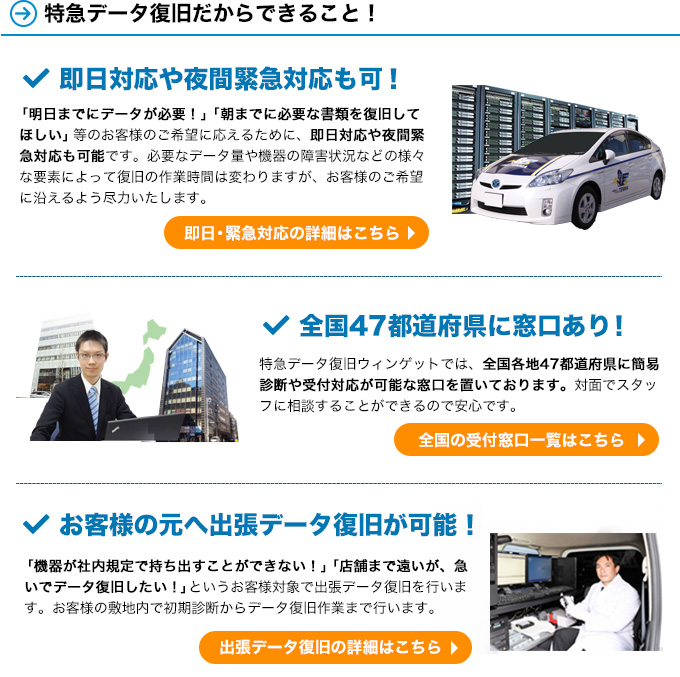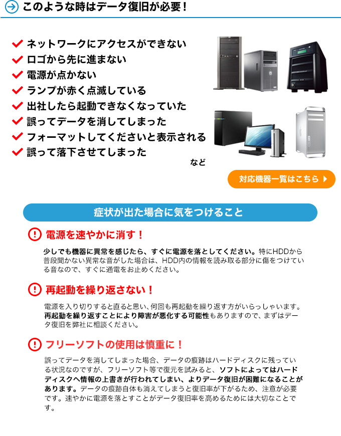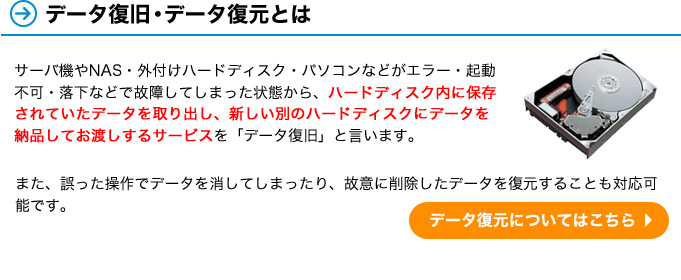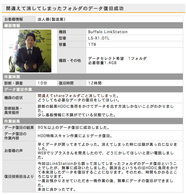 | お客様の声 | 機器が到着した当日にデータ復旧ができたことに驚きました。翌々日にはデータが戻ってきたので業務への影響を最小限にできました。 | ||
