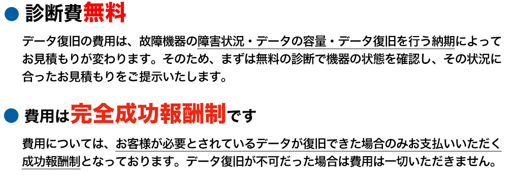 データ復旧の成功時に、お支払いいただきます。お支払い方法はクレジット決済もしくは銀行振込での対応が可能です。復旧不可の場合、無料となります。