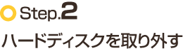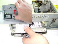 ケーブルを取り外したら、ハードディスク台座の丸い穴に指をかけて、少し持ち上げながら引き出します。 |