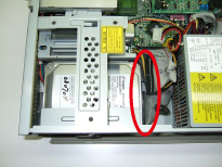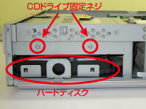 ハードディスクの上にあるCDドライブを外すため、CDドライブを固定しているネジを外します。 |