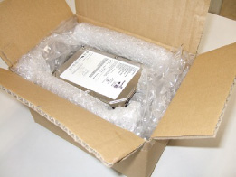 静電気によるデータ破壊を防ぐため、静電気防止処理をされた袋にハードディスクを入れます。 |