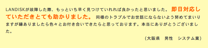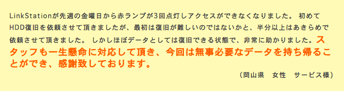 壊れるはずがないという考え自体を改めて考える機会を与えていただきましたのでデータ復旧共々感謝いたしました。