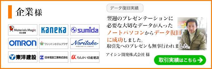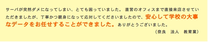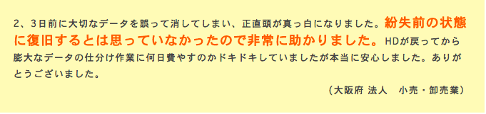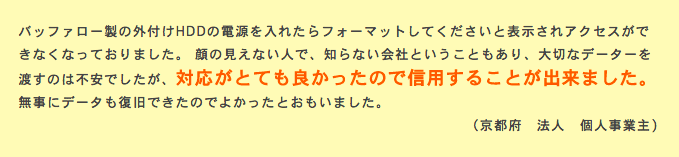 データ復旧をお願いする際にも色々な資料を見せていただき、親身に教えていただきましたのでとても安心してお任せできました。