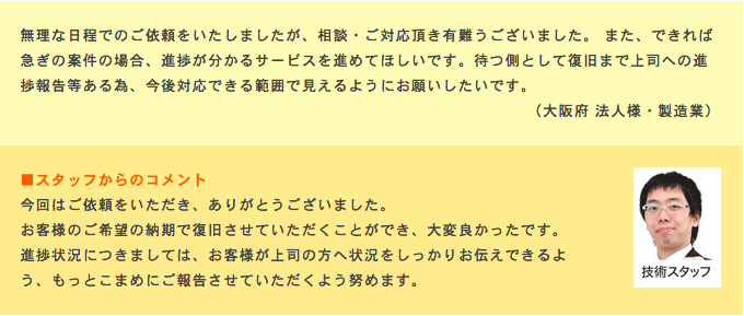 復旧までの流れはスムーズに進めていただきましたのでとても助かりました。